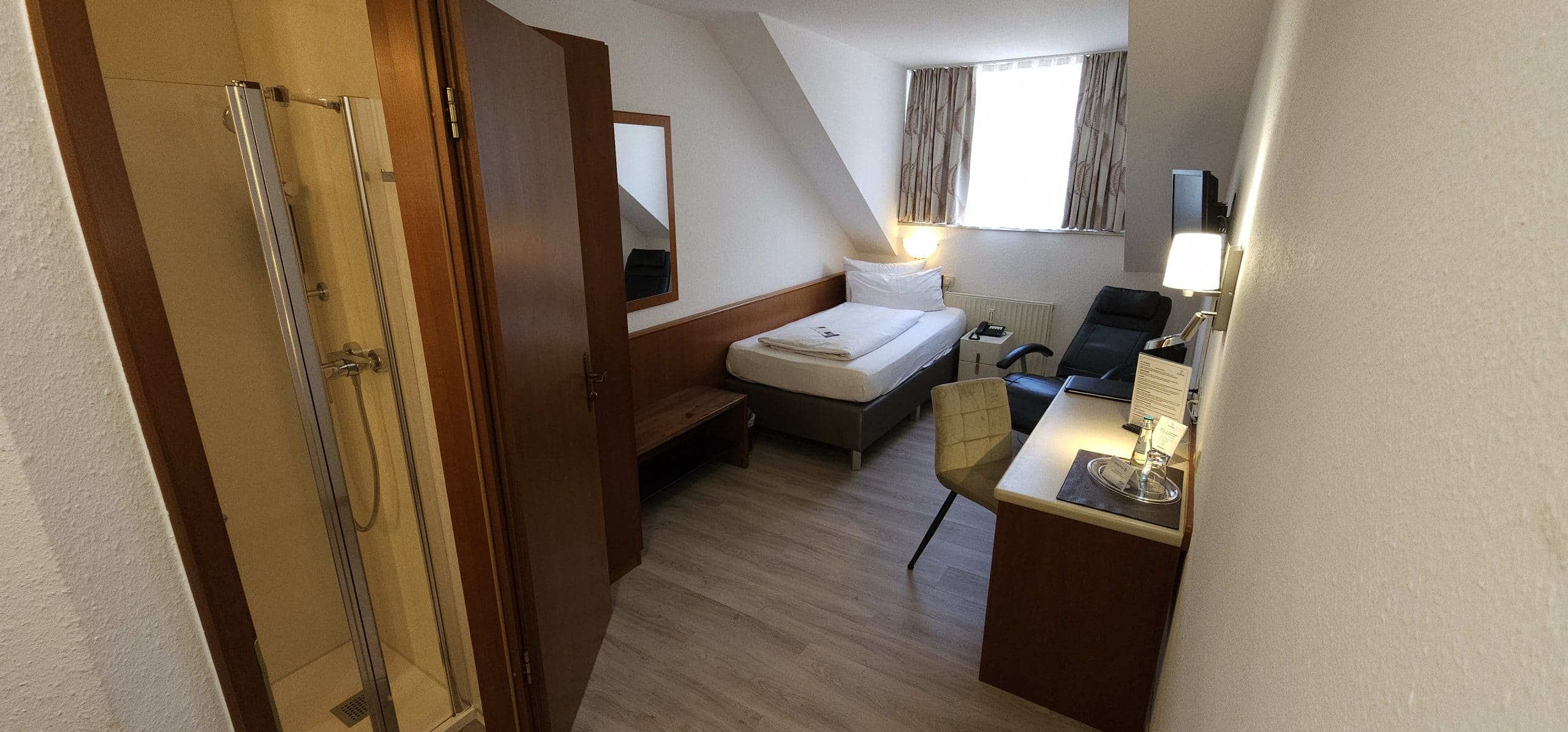 Die „Klassik“ – Einzelzimmer (ca. 17m²) sind mit hochwertigen Möbeln aus Kirschbaumholz eingerichtet, einem 100 x 200 cm Einzelboxspringbrett und verfügen über ein neu renoviertes Badezimmer.